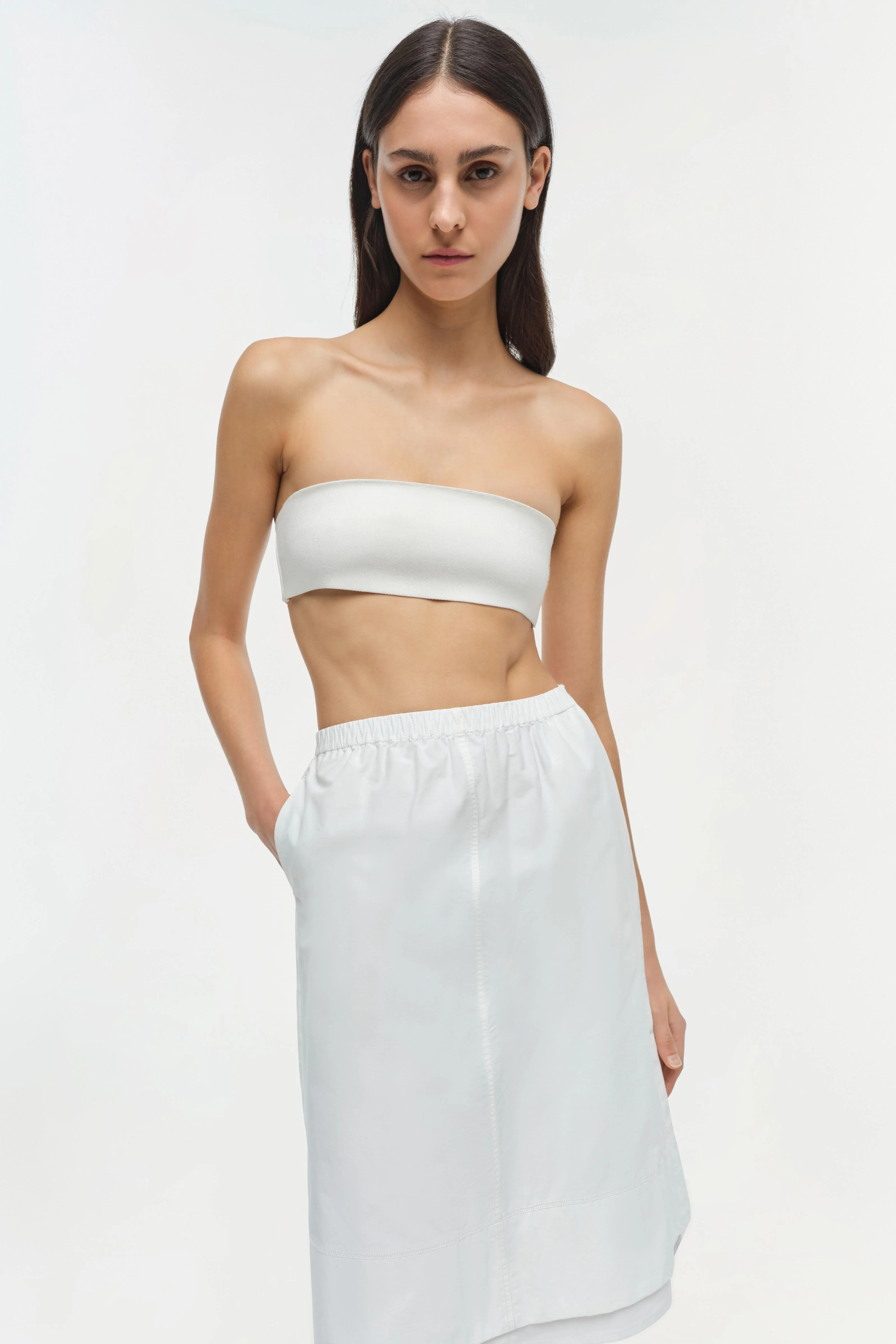 The Aubria Cotton Midi Skirt in White. This tailored cotton faille piece showcases a structured silhouette and refined finish.