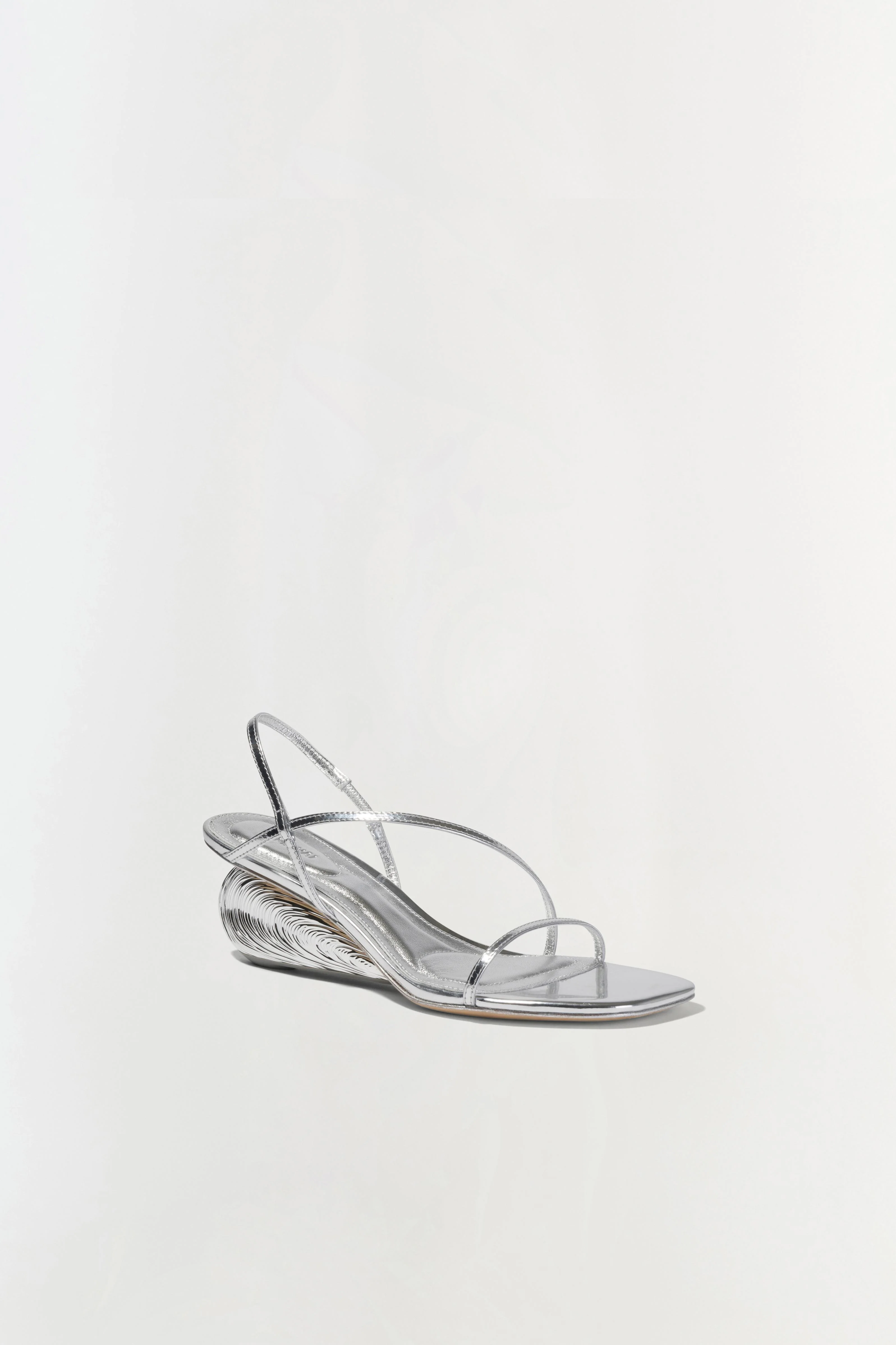 The Bridget Shell Wedge Sandal in Silver. This refined wedge sandal features delicate straps and a sculptural oyster shell-inspired heel.