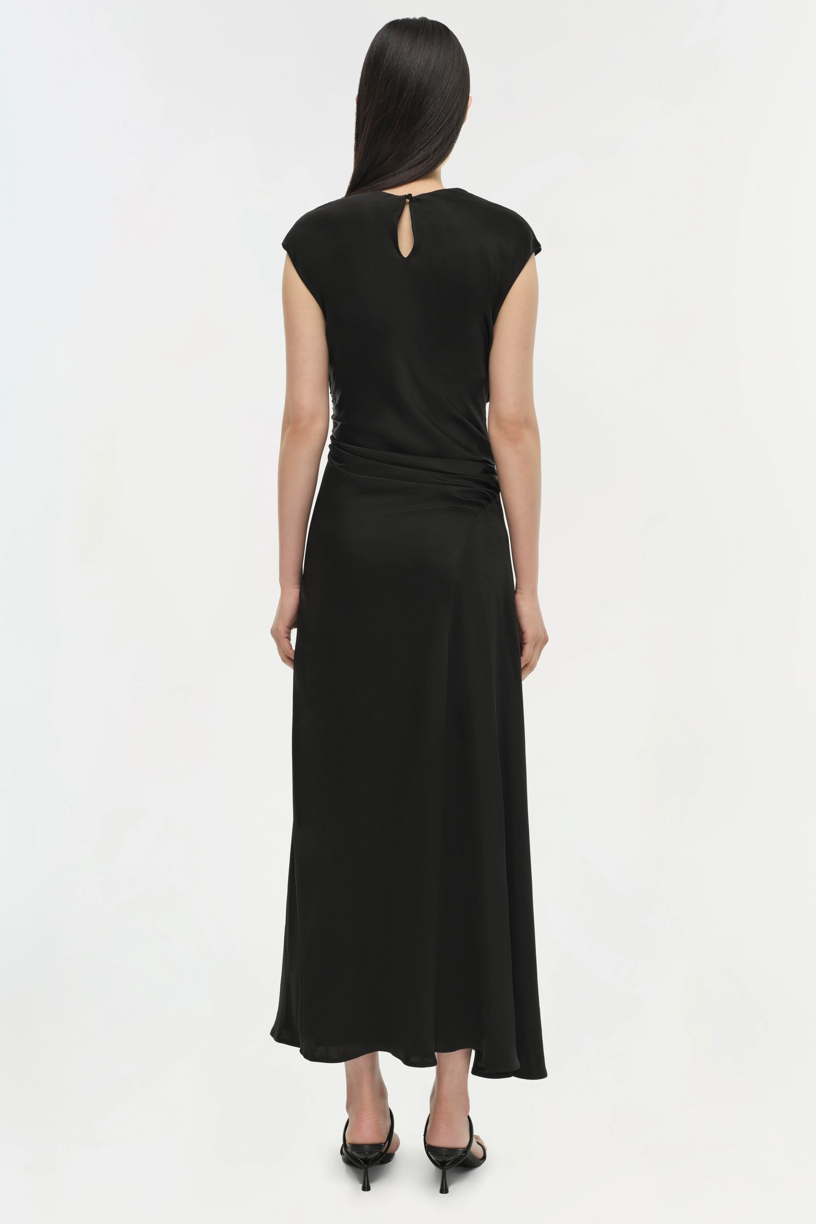 The Burke Dress in Black. This sleeveless draped midi features an elegant draped design with a high neckline and a sophisticated plaid pattern. Its sleeveless cut and fluid silhouette create a refined, timeless look.