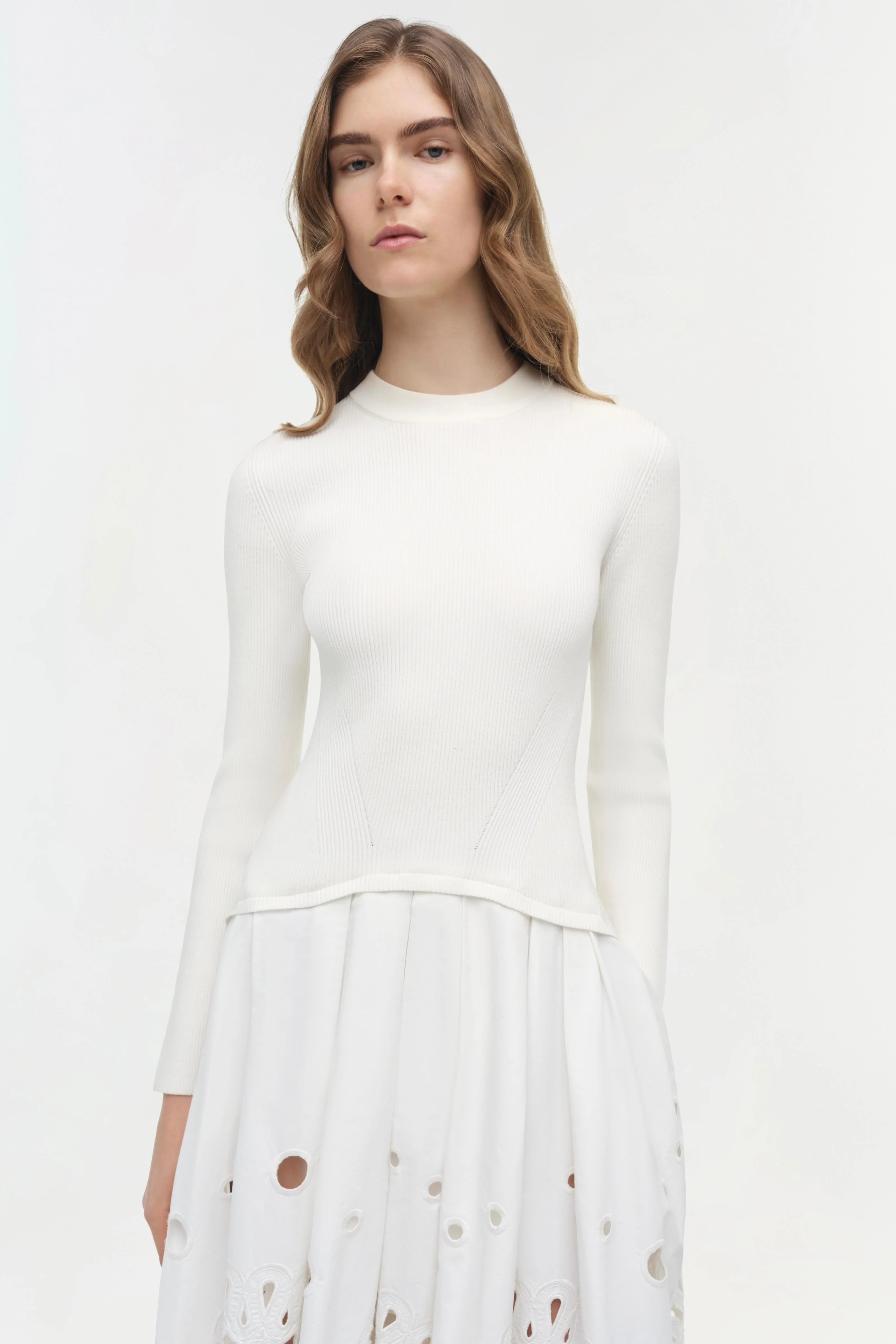 Cut in a compact ribbed knit, the fitted bodice of this midi dress transitions into an eyelet-embroidered cotton skirt with scalloped hem detailing. A refined interplay of textures creates a silhouette that is both effortless and thoughtfully constructed.