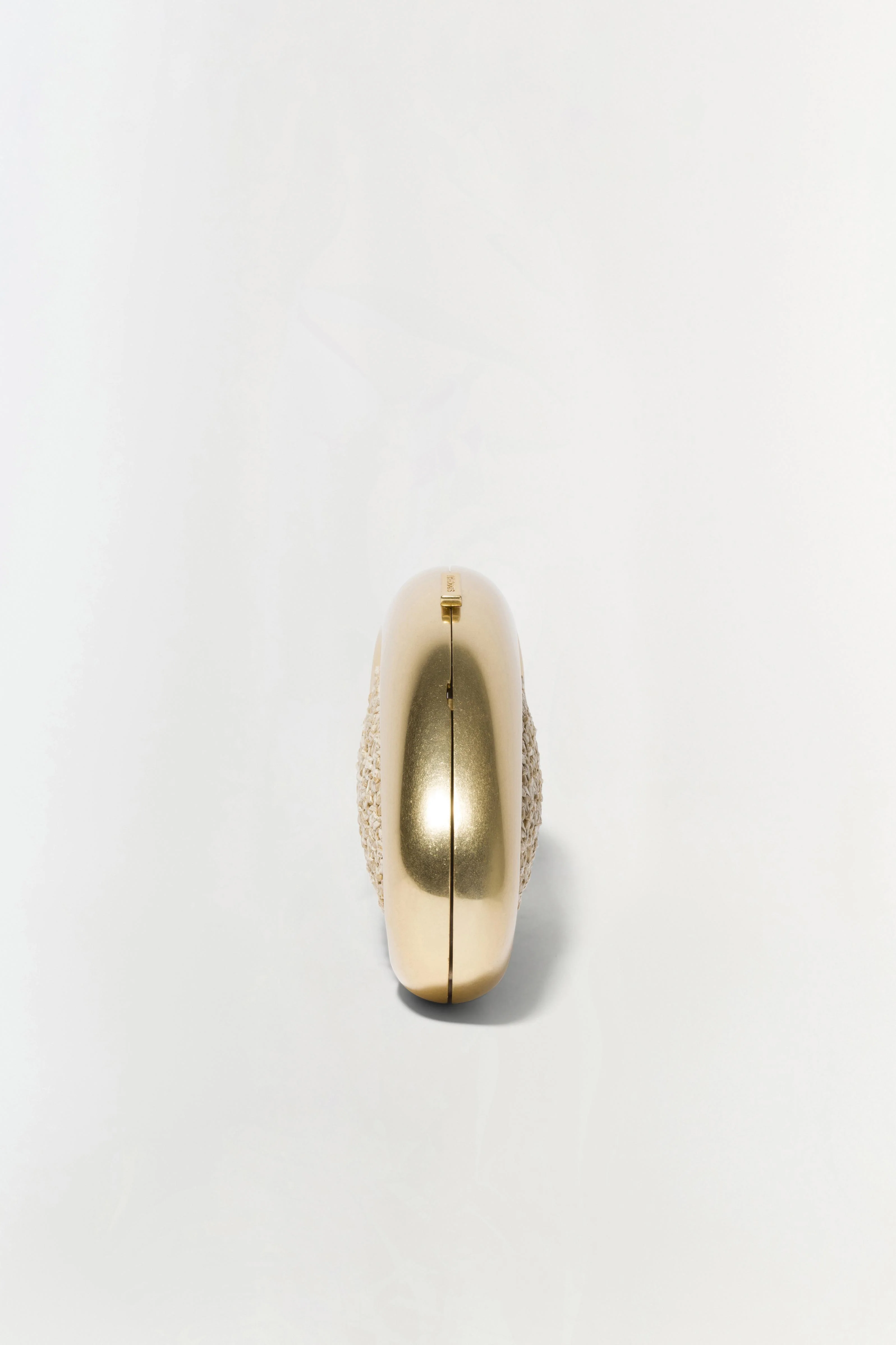 The Luna Raffia Clutch in Natural. This sleek oval clutch features a raffia panel framed by a polished metallic finish.