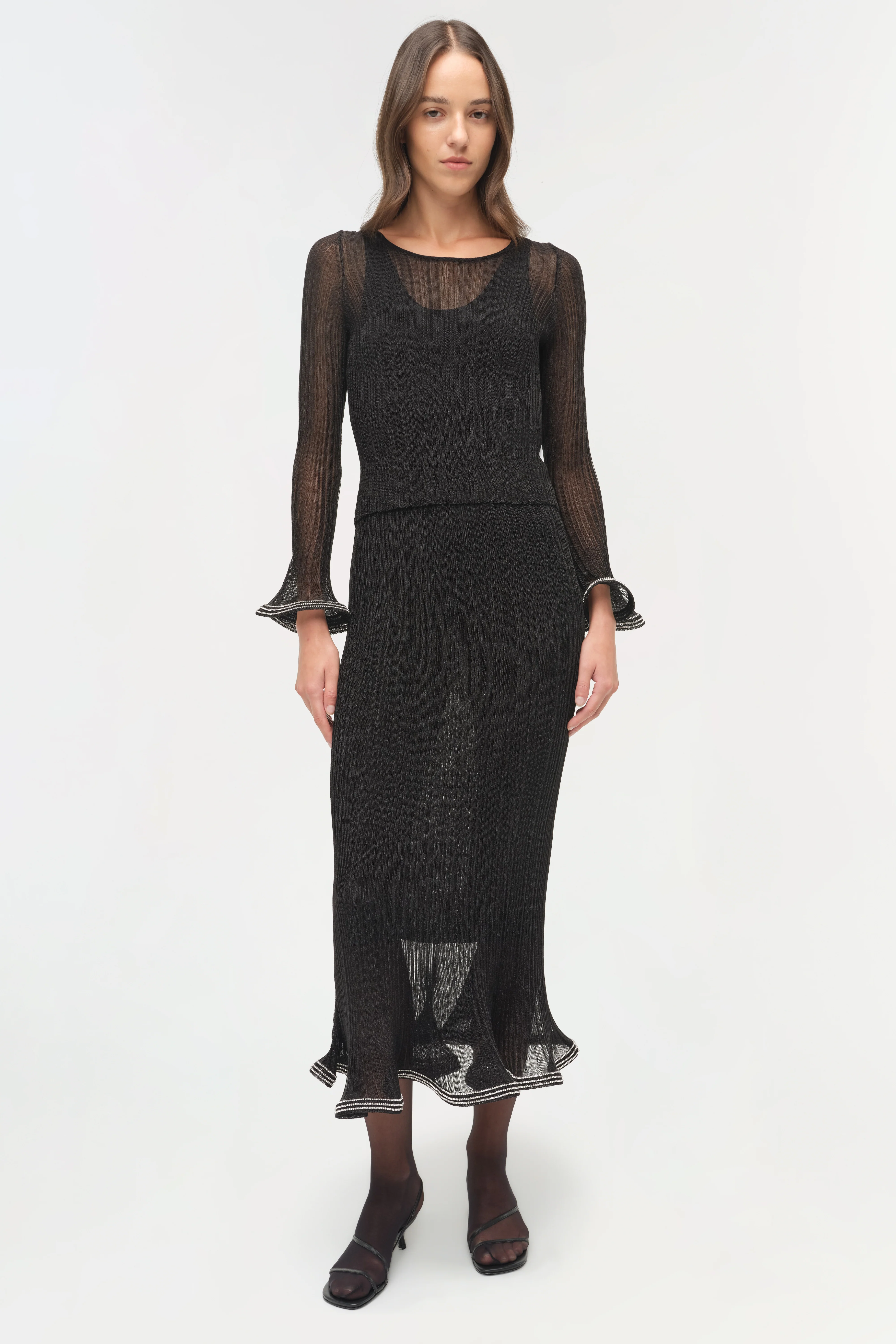 Crafted in a fine plisse knit, this midi dress catches the light with a subtle metallic finish. Designed with a sheer overlay and an integrated tank, creating depth and dimension in a single piece. Fluted embellished cuffs complete the silhouette with a refined, sculptural detail.
