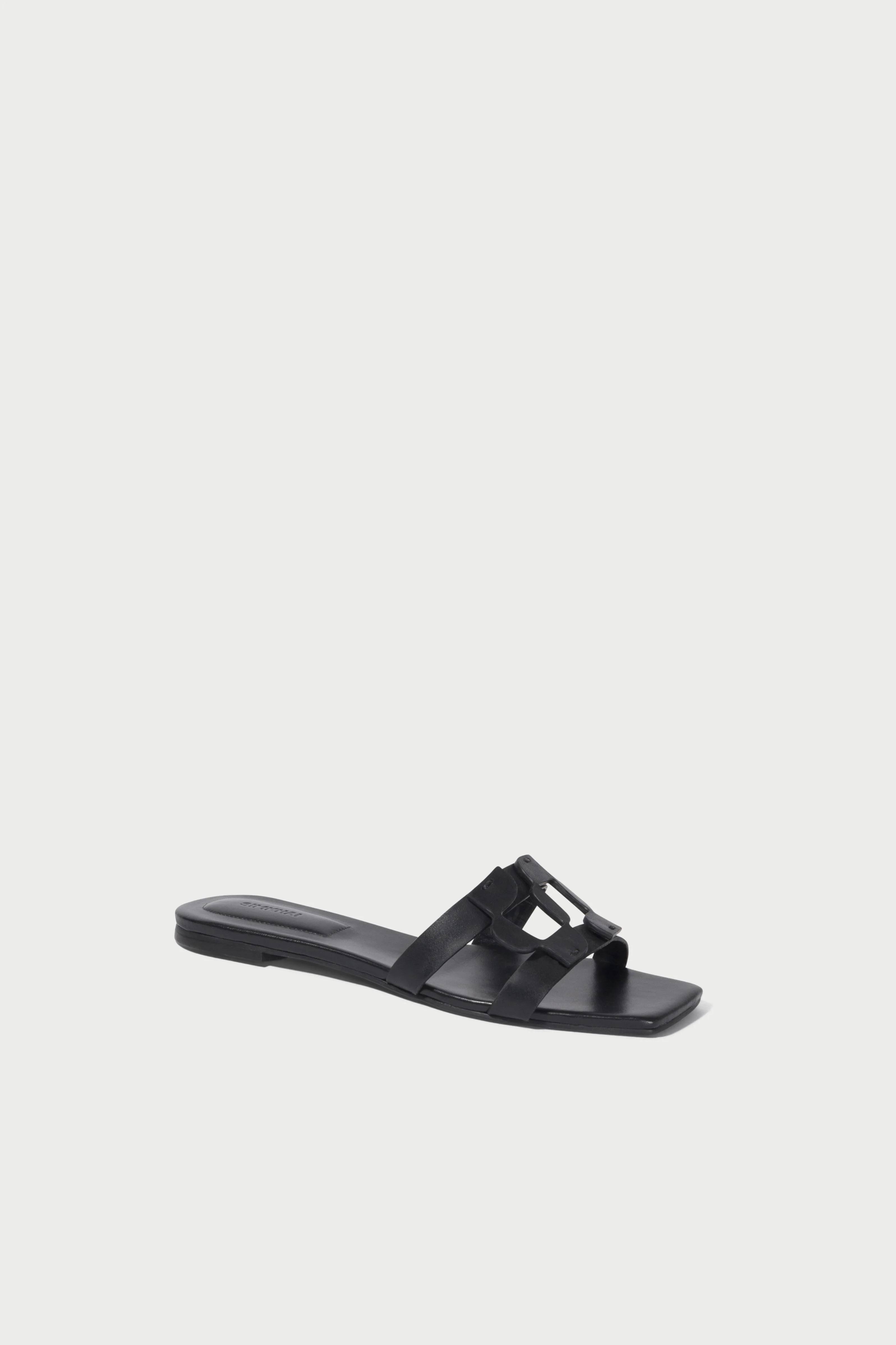 The Simkhai Monogram Slide in Black. Featuring a sleek design and iconic detailing, these flats are perfect for elevating your casual wardrobe.