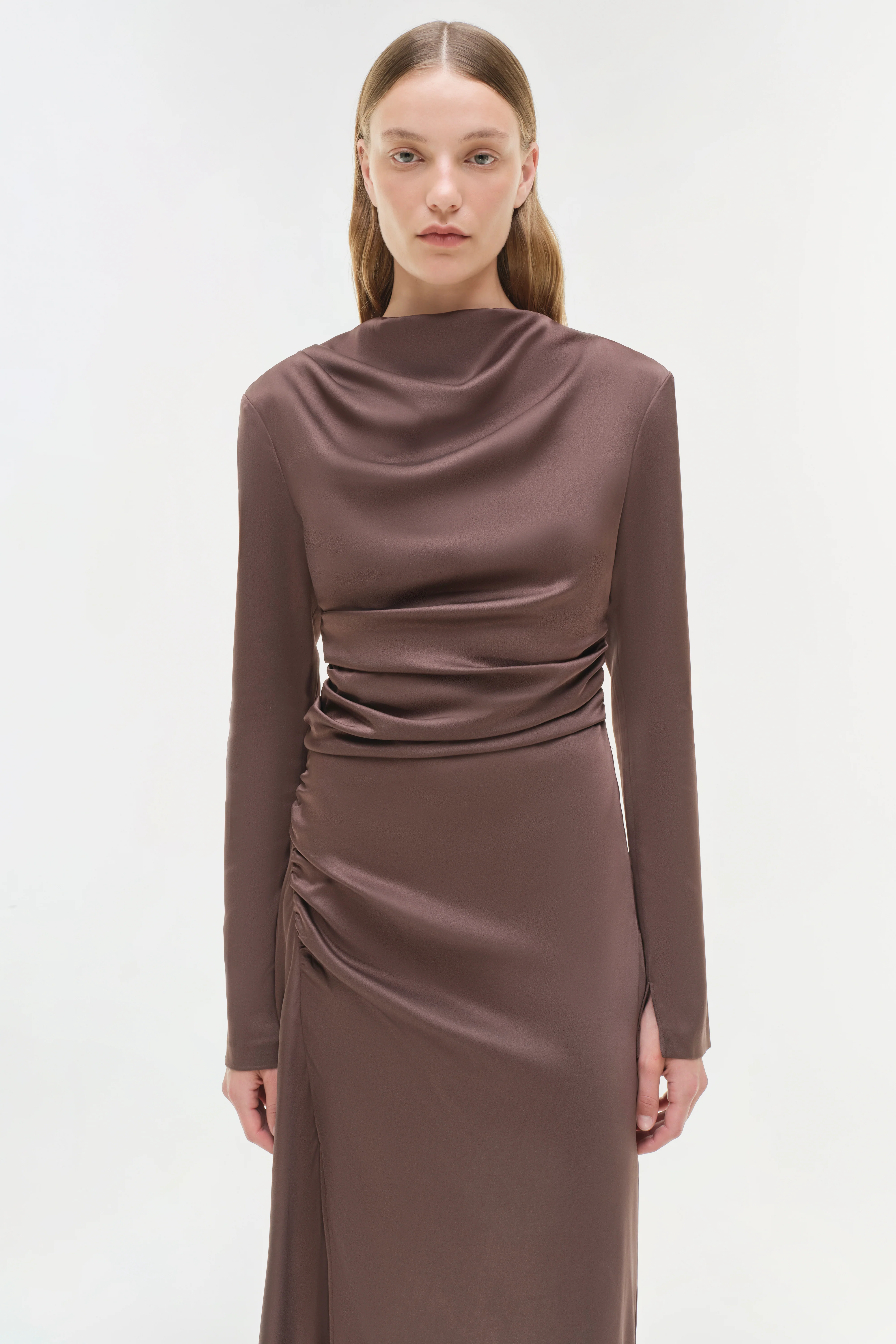 An artfully gathered midi dress with a high neckline in satin for a fluid drape.