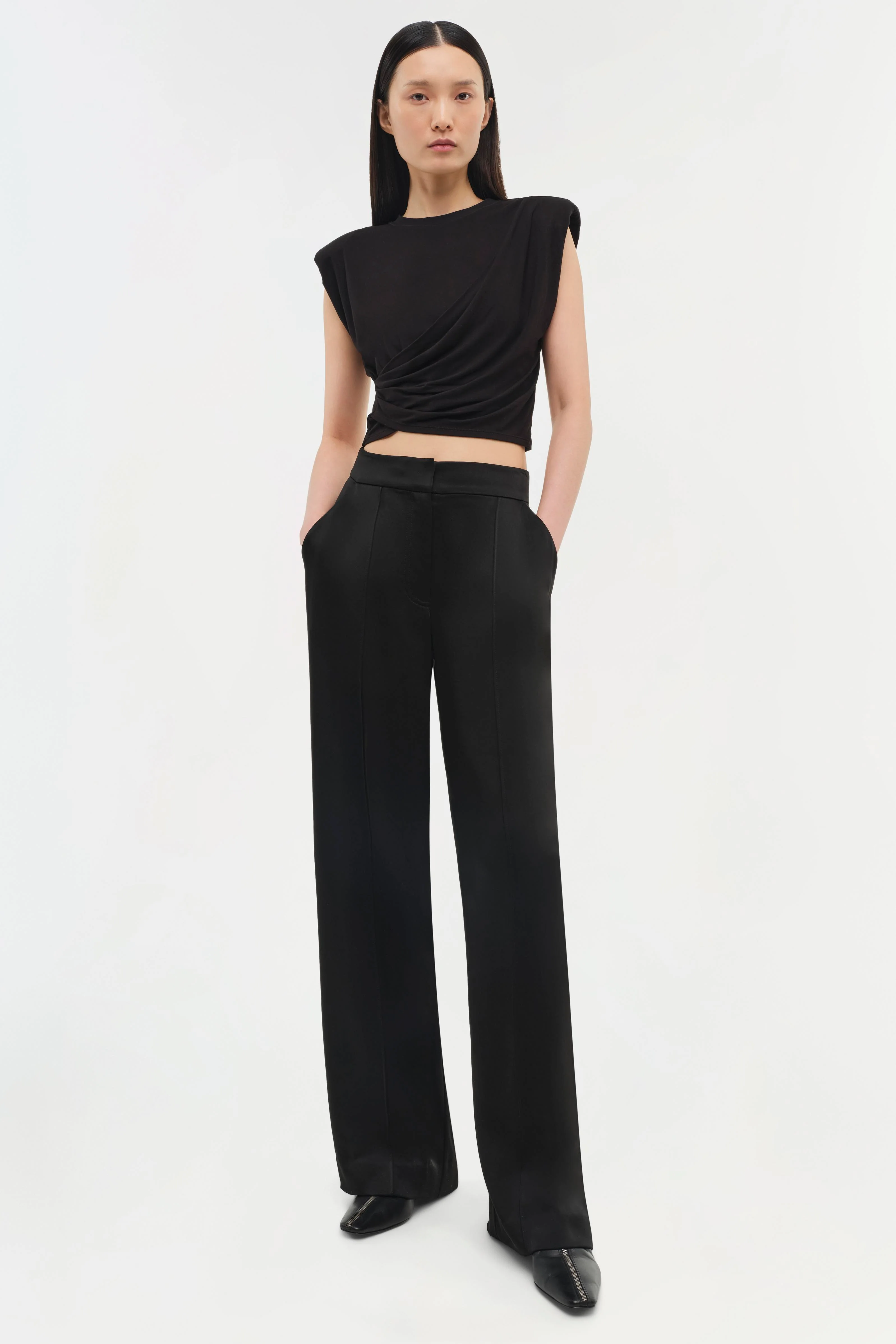 The Signature Estelle Top in Black. Cropped crew neck t-shirt composed of clean stretch jersey. Modern draping creates a wrap silhouette, enhancing its soft-touch appeal.
